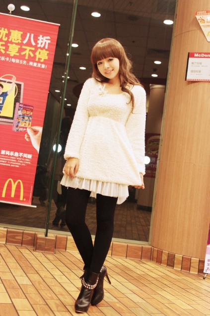 92年出生的我已经在淘宝‘混’了3年多啦!哈哈现在也慢慢开起了自己的小店·!小有成绩!我是开心又百变的小米!最喜欢变来变去·各种风格都会去尝试!希望大家喜欢哦~ 以下分享我的搭配心得哦!搭配:甜美的蕾丝边呢子大衣+高领毛毛蕾丝打底衫+深灰色加厚超显瘦丝袜+红色高跟鞋
