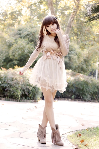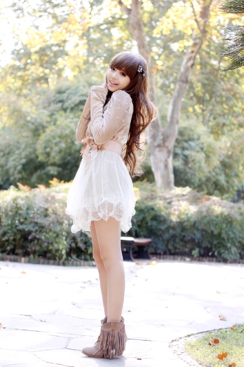 心得:内衬满是毛毛的小外套最保暖啦!里面搭配的是珍珠镶嵌的泡泡袖连衣裙·底下唯美的浪花非常漂亮!美不胜收·也可以配毛毛马甲(还不冷的地区)或者长款外套穿(如果比较冷的地方) 流苏的靴子还真百搭嘻嘻·