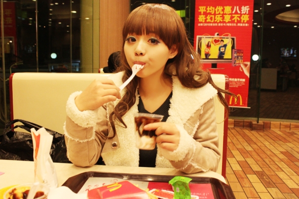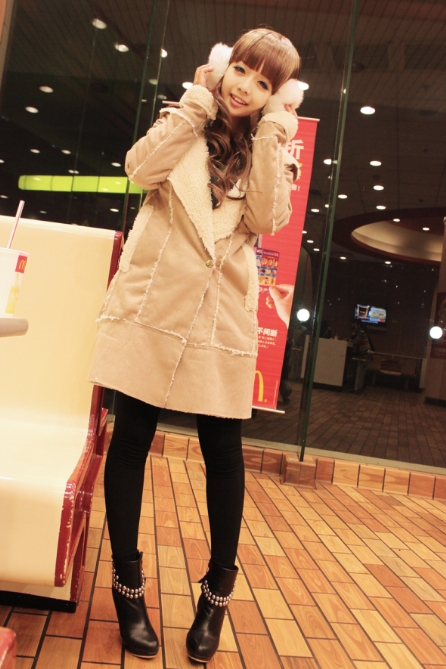 心得:拍摄地点挑选在KFC,暖色调的灯光才能展现这款最温馨的温度,今年最ING的面料是羊羔毛和麂皮绒复合而成,手感很好。同时有很好的保暖性能,绝对是冬季必备的款式,看这就很保暖啦呵呵 美丽耐寒!麂皮绒柔软,有糯性,悬垂性好,质地轻薄。两者结合又有冬装耐寒的特性,同时有轻盈的垂性效果,完全能诠释这件衣服本身的特点和设计