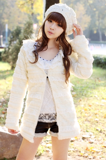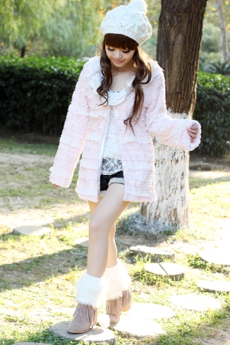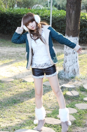 搭配:毛边小棉袄+蕾丝打底+毛边皮质小短裤+耳罩+毛毛脚套