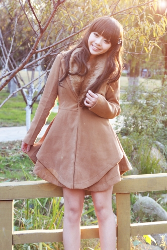 心得:毛绒外套。暖洋洋的,今年日系vivi首推的必备款。点缀在衣服周围的是一圈温暖的毛毛。里面搭配一件V领或者圆领的T,阳光下暖白的镶边更加显得你楚楚可人。袖口处卡其色的毛毛,让衣服多了几分高贵的气息。后背的帽子在秋日里可以为你挡风,也可以让你的后背不会显得特别臃肿。腰间的插袋设计非常随性。当你双手随意的插在口子漫步在阳光照耀的街头是一番何其惬意的景象!