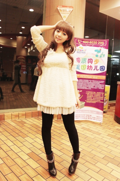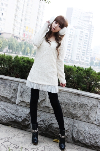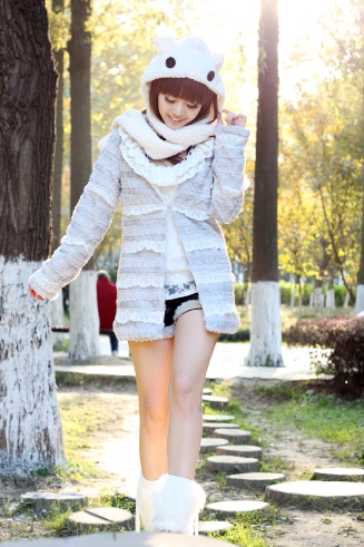 搭配:白色毛线球球帽子+蕾丝波浪圆领打底T+蕾丝和毛毛结合于一体的外套+毛毛脚套+毛毛边可爱靴裤!