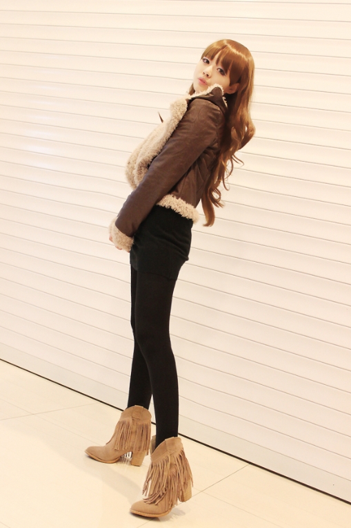 搭配:毛毛里衬巧克力色皮衣+流苏靴+黑色V领长T+黑色长袜(或者帅气的牛仔裤)