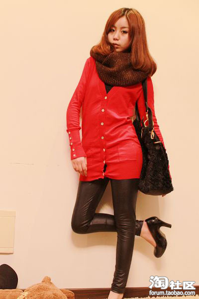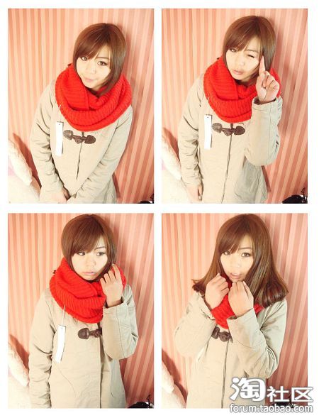 大红色 很正很正的大红色 喜庆的感觉 搭配咖啡色的围脖 整体效果很好拉~