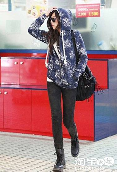 :搭配紧身裤子和印花帽衫也是十分不错的选择。
