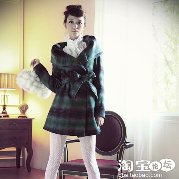 韩版格子毛呢大衣+花边衬衣+白色打底裤
