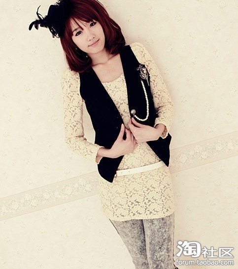 一款蕾丝的长T恤 加上一款黑色的马甲