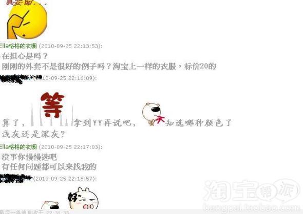 2010年的09月25日参加群里的拍卖活动,到了我的宝贝的拍卖过程中,竟然没有几个客人捧场的,当时搞的我莫名其妙,以为怎么了,等拍卖结束的时候,群里的一个群友对我的宝贝提出了质疑,说我的宝贝儿价格高,希望群主以后审核的时候多看看,我当时非常莫名其妙,感觉特委屈,在淘宝这样的江湖里,宝贝的质量很重要,我坚持以宝贝质量的好坏决定产品的价格,那晚大家拍到宝贝的都非常担心质量问题,因为不单单是我家的宝贝,他们上网搜了一下说,真的淘宝上价格都好低哦,大家对好几款产品都产生了质疑,那晚拍我家宝贝的客人,也担心了,尽管我说了如果您收到不满意的话,料子很差的那种的话,你可以申请退货的,我不会拿质量不好的东西来砸自己店铺的招牌的。