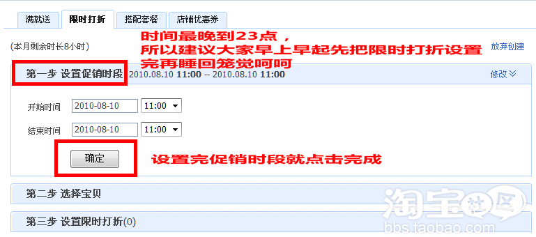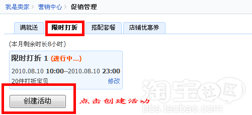 设置方法:“我的淘宝—我是卖家—营销中心—促销管理—限时打折”创建限时打折活动
