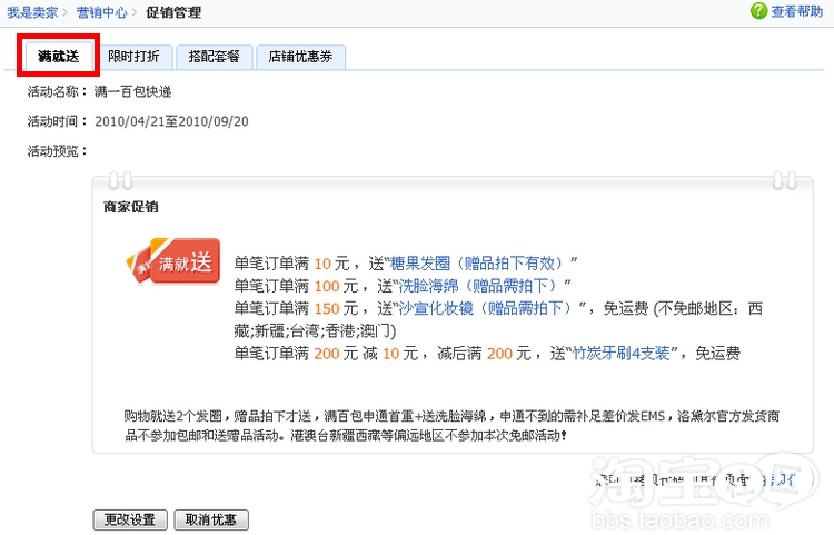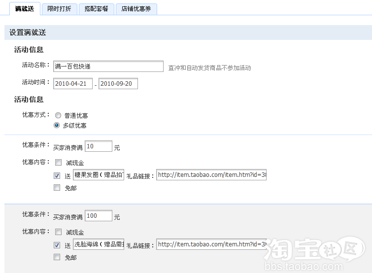 现在我就把“满就送”和“限时打折”使用方法和各位朋友分享: