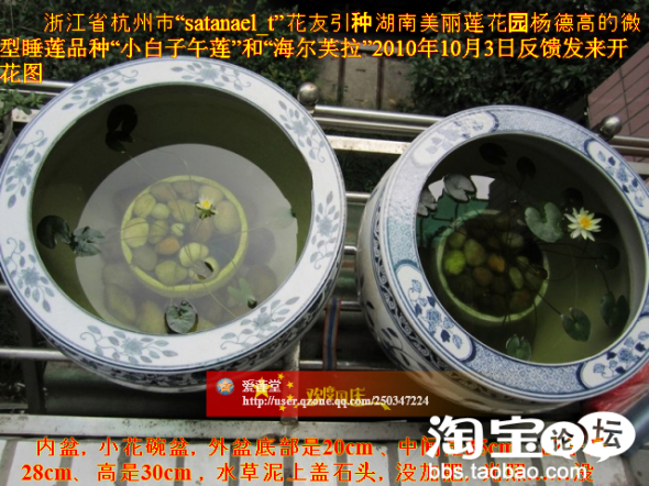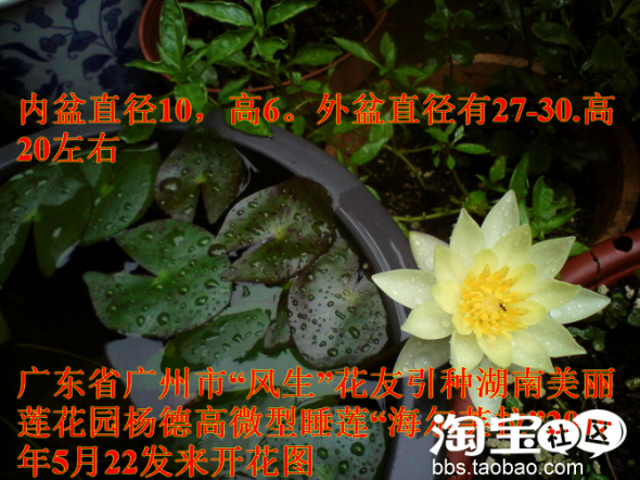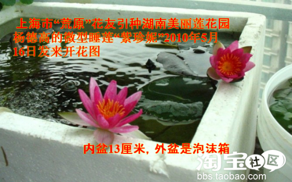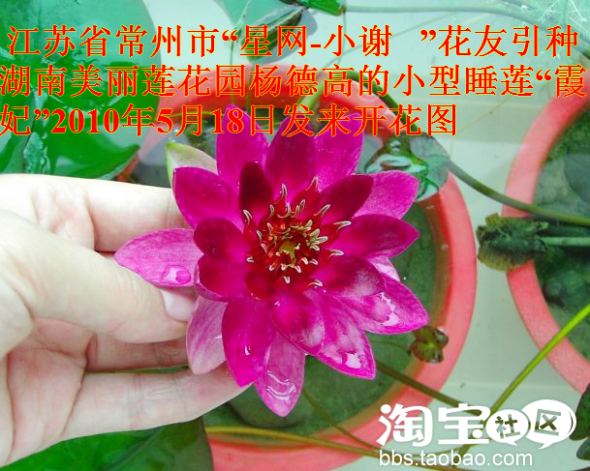5月8日,上海的花友来淘宝,说:“以前种过中型 睡莲,去年拆迁了,水池里的睡莲带不走,没有地方种,最后,我全偷偷的种到公园的池塘里去了,心里好像自己的女儿出嫁了一样,今年去公园看过一次,全长的很好。到了新房子,割舍不下,就网上找有没有微型迷你的,于是有人介绍找到了你,现在马上买,错过了又要等一年了。”好一个爱花人,好一个能花美丽更多人的人。“你发货状态改掉,我把款打给你,免得过几天收到货我自己忘记。”