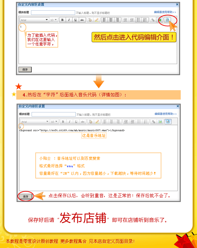 注:歌曲地址,可以到百度搜索,建议搜索wma格式或MP3格式,容量在2M以内,否则在店铺打开时会下载很久才听到!如下图所示: