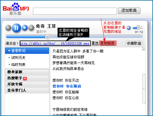 3.点击试听后,最好是听完一次,因为有些歌曲只有一半就没了,听了觉得没问题后点击复制链接,这里复制到的就是歌曲地址了!http://s60sj.cn/bbs/upload/2010/02/18/182021336.wma 一定要是这种全的,不是中间有...省略的。有省略的是不能在店铺听到的。如下图所示