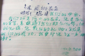 当我看完“开学第一课”,将这些心理写下来的同时,女儿在旁边递给我一张纸条,并深情地朗诵时,我第一句话问她,是你抄的还是自己写的?女儿不加思索地说:是我写的。我拿过来仔细看时,不由得多看了女儿两眼,从来没有跟我说过祖国花朵一词的她,怎么会崩出这样的一个小短句来。我从没有跟她提起过祖国强大对于她意味着什么,因为怕她听懂的只是语言。经常对她说的最多的就是:一个人在家里首先要做个好人,因为你代表的是你自己,别人会来评价于你;当你走出这个家庭,你代表的就是这个家庭,一举一动都是一个家庭教养的深厚与否;而当你走进一个学校,就是代表一个学校,学校的荣誉也全在于你的一举一动;走出西安,走出陕西,你代表的就是西安,就是陕西人的素质和态度;而当你走出国门,你代表的就是中国人,你不能让别人因为你在说话之前会冠上一个“中国人……” 我只是跟她这样讲述一个从点到面的一个个人产生的影响力。