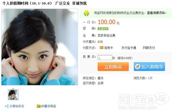 在刚刚过去的国庆假期中,有关一位女孩在淘宝网上售卖国庆长假的消息,在各论坛和QQ群里引发激烈讨论。