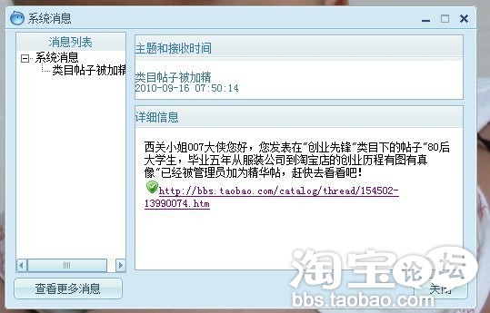 从策划到店铺装修整整花了一个月的时间,九月份小店正式营业了,跟所有的卖家一样,我是怀着美好的憧憬又一次向淘宝进军了!万事开头难,整整一个星期都无人问津。后来去论坛讨教了,没流量发精华贴啊,晚上我喝了瓶墨水开始操笔一直写到十一点才写好,连夜发到了创业先锋去了。但是逛淘宝的人全睡觉去了,有谁看啊。第二天早上,刚打开电脑就跳出一个消息,我以为有人买我的宝贝了,一看是我的贴子加精了!还上头条了。