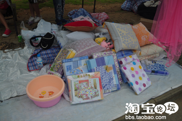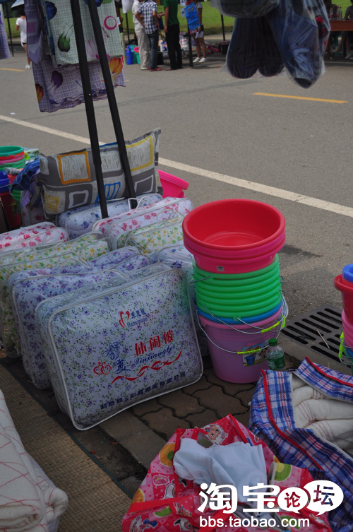 到了之后,首先映入眼帘的是摆得毫无美感的被子和枕头= = 摊子上胡老板和几个找来帮忙的男生在那聊天,看到货物的造型就可以想象他们寝室是个什么样子了= =