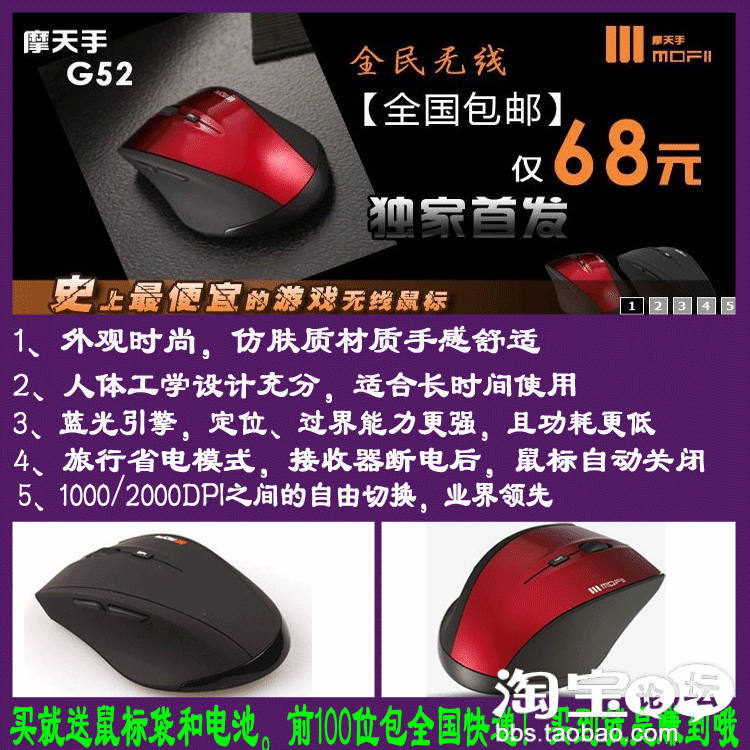 此款产品是磨砂质感,手感超级好的,2000DBI灵敏度极高,游戏竞技玩家的不二之选目前国内180元以内的鼠标最好的可以做到800到1200DBI的切换。而我们只要68元可以实现1000到2000DBI的自由切换。摩天手永远追求性价比最高。实现全民无线!此宝贝连接地址:http://item.taobao.com/item.htm?id=6799014753直接复制连接即可更多宝贝详情请进:http://dongzhi123.taobao.com