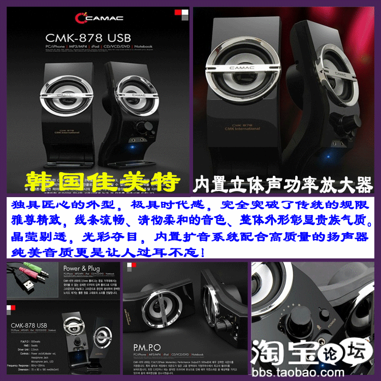 韩国佳美特878音箱独具匠心的外型,极具时代感,完全突破了传统的规限,晶莹剔透,光彩夺目,内置扩音系统配合高质量的扬声器,演绎出雄浑有力的完美音色,集艺术与潮流于一身,纯美音质更是让人过耳不忘!!! 雅尊精致,线条流畅、清彻柔和的音色、整体外形彰显贵族气质。 采用电源接口,独立音量控制操作更方便 内置立体声功率放大器,携带方便 适用于笔记本电脑和台式电脑、MP3、MP4等 产品说明: 1、内置立体声功率放大器。 2、带有音量控制,开关控制; 3、功率:1.5W*2 音量放最大也不会有变音或破音现象 电源供电,携带方便,是笔记本\台式机电脑的最佳搭档1、品牌:佳美特(CAMAC)2、型号:CMK-8783、扬声器:2(防磁)4、功率:1.5W*25、颜色:黑色6、尺寸:48.2x44.5x41.5(mm)7、频响范围:100Hz-20KHz(Hz)8、承载功率:500(W)9、适用:台式电脑、笔记本电脑、Mp3、Mp4、MD、Diskman、部分型号的手机(需要转接线)10、产品通过3C认证此宝贝连接地址:http://item.taobao.com/item.htm?id=5727525443 直接复制连接即可更多宝贝详情请进:http://dongzhi123.taobao.com