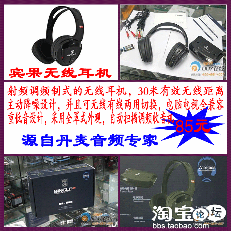 丹麦宾果耳机 B610 这是一款射频调频制式的无线耳机,有效距离达30米,采用全罩式外观、主动降噪设计,并且可无线有线两用切换,电脑电视全兼容电视RCA接口与电脑插针都可使用,值得一提的是这款无线耳机重低音效果非常出色,抗干扰能力强此宝贝连接地址:http://item.taobao.com/item.htm?id=7039825127 直接复制连接即可更多宝贝详情请进:http://dongzhi123.taobao.com
