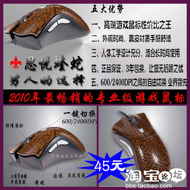 掌柜强力推荐思悦蝰蛇610有线游戏鼠标此款鼠标就不多做介绍了,懂行的人一眼就可以看得出来,绝对物超所值,2400DBI高灵敏度,高端5键设计,一键切换,本人自己就在用此款鼠标,真皮质感,最专业的游戏加重配置,无与伦比的价格现在仅需45元,蝰蛇鼠标带回家,一起来享受高灵敏游戏中带来的快乐吧~~此宝贝连接地址:http://item.taobao.com/item.htm?id=7064565719 直接复制连接即可更多宝贝详情请进:http://dongzhi123.taobao.com