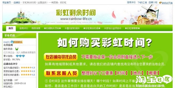 店铺名:彩虹剩余时间(全国连锁)----有困难,找彩虹 店铺网址:http://cheaper.taobao.com或www.rainbow-life.cn店主旺旺id:inse01本店铺的特色: