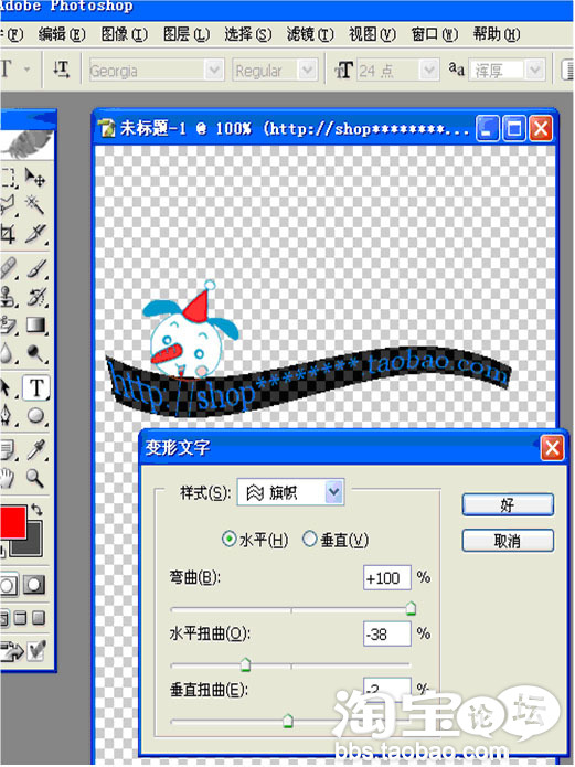 第八步:设置字体、字型、字号、字体颜色和样式。选中输入的“店辅网址”,分别点击“字体格式工具栏”(如上图中的红圈所示)中的字体、字型、字号、字体颜色和样式下拉按钮。将“店铺网址”设置自己喜欢的字体类型和颜色。(注意:字体颜色要淡点的)。下面点击“样式”,选取“旗帜”,在出现的对话框中完成相应的设置,"店铺网址"就变成下图中的样子啦!。如下图所示: