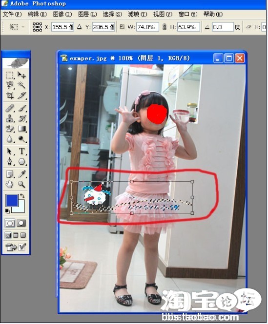 第二步:在PS中打开自己的宝贝展示图片,然后点击“编辑”菜单中的“粘贴”,这个时候大家就看到了水印出现在自己的宝贝图片上。下面继续使用原贴中“第二步”方法将“水印”选中,再使用原贴中“第六步”方法将“水印”缩放到合适大小(不能太大哟,因为你主要是展示宝贝,水印必竟是次要的)。如下图所示: