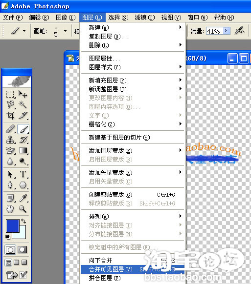 第十步:选取“图层”菜单中的“合并可见图层”,然后点击“文件”菜单中“存储”完成保存,至此属于自己的个性化店铺宝贝水印制作完成。