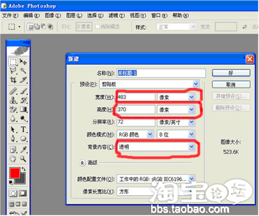 如图“红圈”所示。高度和宽度可自行设置适当的数据(如500*400)最重要的是背景内容一定要设为“透明”。设置完之后点击“好”。