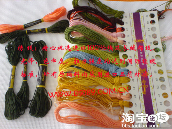 注意:最近有不少无良商家以廉价涤棉线冒充进口线欺骗消费者,对此请大家擦亮眼睛以免上当受骗,检验方法如下:涤棉线用打火机烧火苗很大,冒黑烟,烧完呈板状或颗粒状,棉线烧完呈灰装,有棉的特殊气味!十字绣牌子很多,价格也相差很远,甚至有些大图如六尺牡丹,全棉线要100多,涤棉线只要60多,棉的价格节节攀升,所以好多厂家用涤棉线代替棉线,让买家辛辛苦苦绣出图来,却在清洗过后掉色,裱框后起黑斑。因此在此我希望广大淘友选十字绣时不要只看价格,还要看质量!