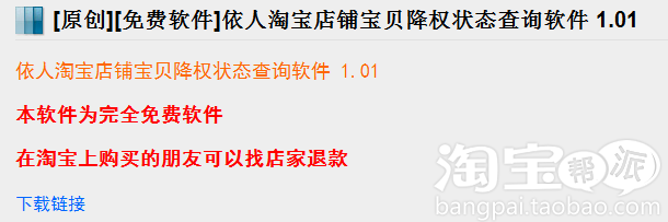 其实这个软件名字叫做“依人淘宝店铺宝贝降权状态查询软件 1.01”大家可以上网查下这个软件,很多下载地址的,都是免费的。