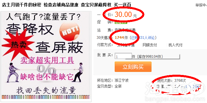 最近旺旺上收到不少信息,都是关于什么“检查店铺商品健康 查宝贝屏蔽降权”软件的。特意上网查了下,原来这款软件其实是免费的,看到那些黑心的卖家竟然将这个软件卖到30元每件,并且销售额都在千件以上,查了下淘宝上的销售情况,短短一月竟然售出的有几万件,不少人上当受骗,真实心寒,就是很多金冠店的宝贝也没有卖到这么疯狂吧,令人反思不解啊。