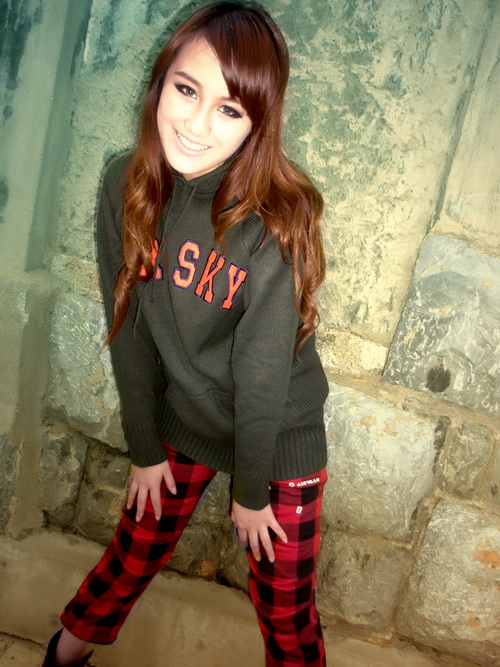 所以小米米也选择了这样一款连帽毛衣。搭配色彩冲突的红黑格子的7分裤子