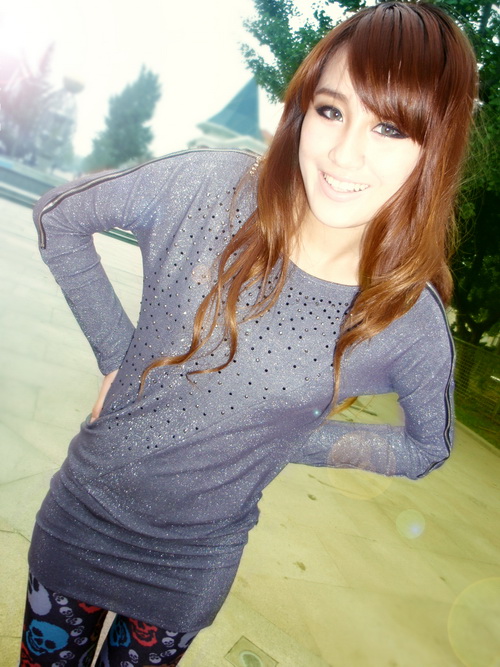 深灰色铆钉拉链长t+彩色骷髅头打底袜