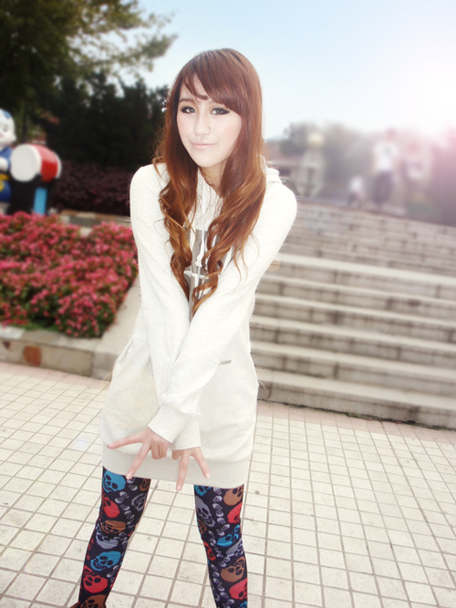 白色宽松大卫衣+骷髅彩袜子+流苏靴