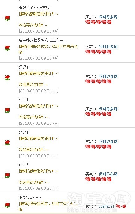 很多新手卖家往往会忽视人家给你的好评,千万别放弃这个和买家沟通的机会,给人家回评,人家自然对你+印象分,要知道,我们与皇观和4,5颗钻的人比根本没优势,货源比不上,人气比不上,还有很多比不上!但在服务方面我们有得拼,信誉高的很多都是聘请来的人员来做服务和我们比,他们肯定没我们热心,毕竟一个是自己的店,一个是别人的店,只有抓住这点,一点点的抓住客人,我们才能慢慢往上爬!!