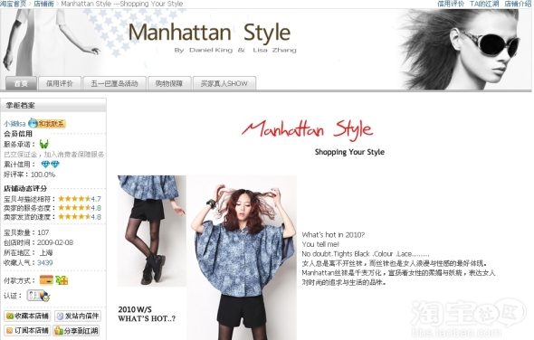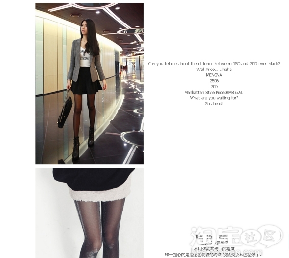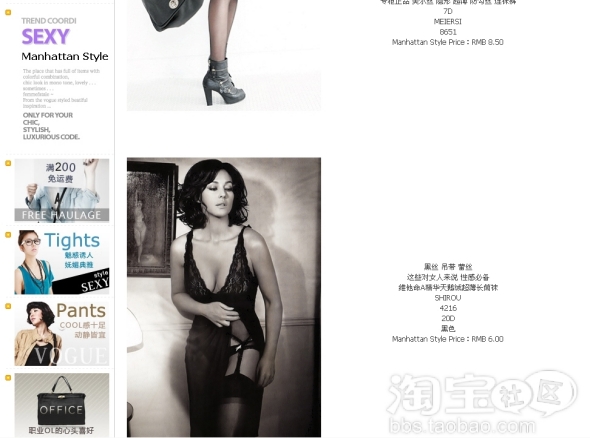 店铺名:Manhattan Style---Shopping Your Style店铺网址:http://lisa-zhang.taobao.com店主旺旺id:小柒lisa请一句话总结描述本店铺的特色:独特的视觉、非凡的品质、完善的售后。成就丝袜控们的性感ZONE .