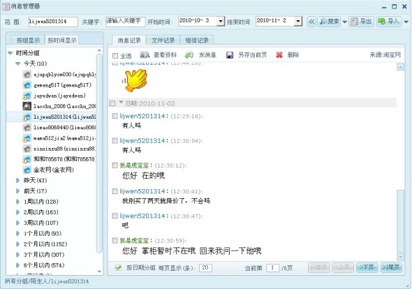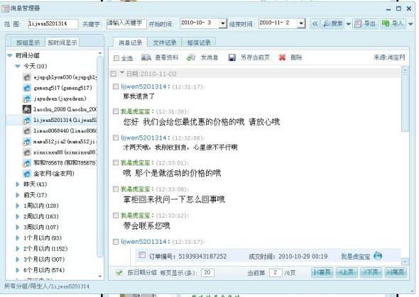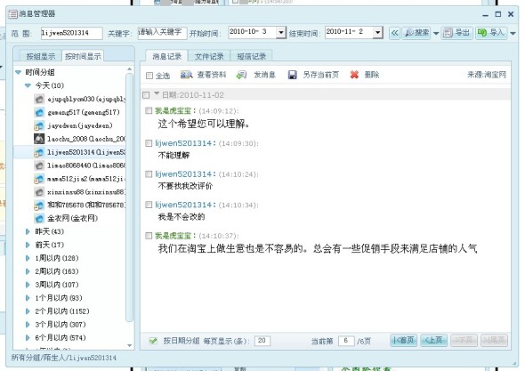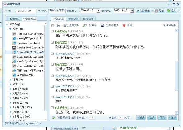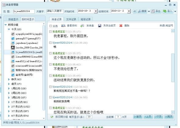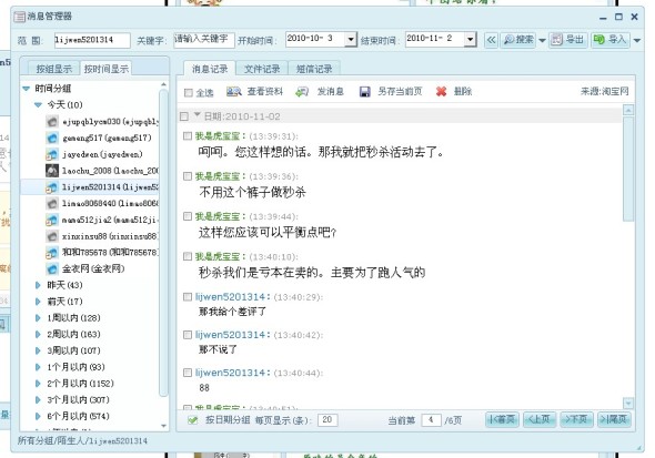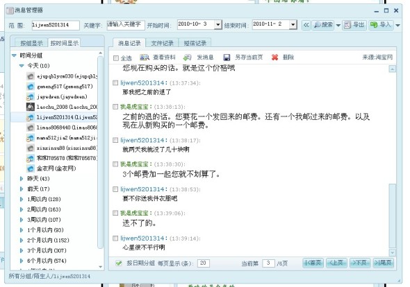 10月29号,一广东买家来我店里买了个裤子。原价168元的。很爽快的拍下付款那种。自己也开心。宝贝卖出去了。呵呵。乐了好一会。11月2号的时候,觉得这个裤子很不错。决定拿来做秒杀活动。7折秒杀。因为看到文章说。7折秒杀有可能会上淘宝首页。免费推广。很开心的就把限时折扣功能给设置好了。下午拿货回来,朋友告诉我。有个买家买了东西现在过来理论了。我以为怎么了。是不是东西不好呢。不好的话。我们是消保卖家。可以7天无理由退换的。来不及先喝口水就马上坐在了电脑面前。下面的图片是我和他的旺旺聊天记录。大家评评理。