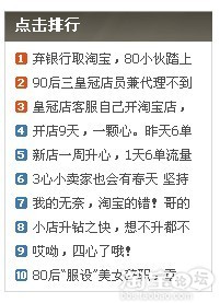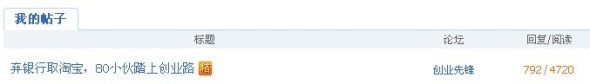 ”!!从那开始就打开WORD文档记录自己的经历!!(这时已经是晚上1点多了,费了N个小时)。。还好皇天不负有心人,芋头的付出是值得的,于是就诞生了芋头的第一篇精华帖“弃银行取淘宝,80小伙踏上创业路”。(点击率排第一呢