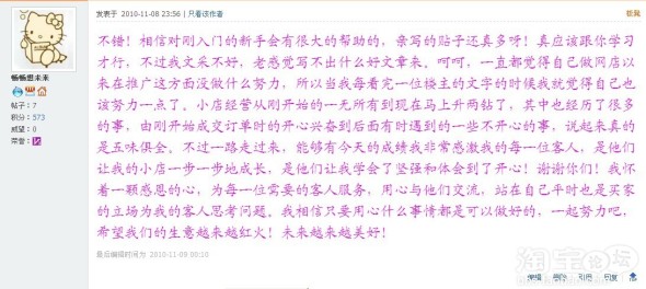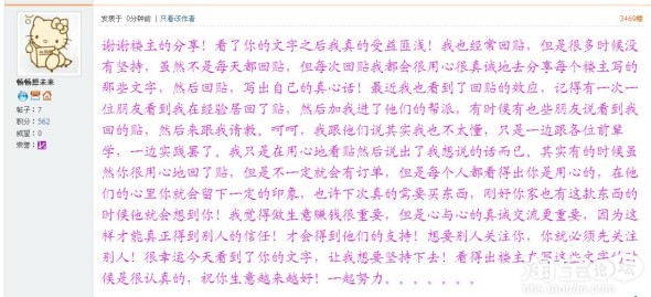 做网店以来,我在推广上一直没做什么努力!做了妈咪自己带宝贝的朋友应该都知道带宝宝是件很累的差事,他小的时候还好,给他喂饱了他就睡,现在长大了会跑会跳了,对什么东西都好奇,真的是太好动了!带他是很辛苦,不过有时也觉得自己对不起他,因为基本上很少有时间带他出去玩,但淘宝却是我一直的梦想.所以一有时间我就叫他爸爸带他出去跟其他小朋友玩玩,那一出去,真的像是一匹奔放的野马一样,快活得不得了啊!我希望他的童年可以过得健康快乐,我会更加努力给他更多他想要的!也希望大家的宝宝都一样健康快乐的成长,也许也有人跟我一样,是自己带着宝贝在淘宝开店的.上次我看贴就看到一位,真的很幸运原来有很多的人在跟我一起努力!最近比较专注淘宝,每天等宝宝睡觉后会去社区逛逛,跟各位前辈学习一些有用的知识,认真的回贴,说出自己想说的话.也许是灵感,有时候看了楼主的文字就会有很多的想法想要发表一下,有同感也有我自己的见解.下面发几张我这几天在回贴时候写的话的截图给大家看看,呵呵,有什么不好的地方大家帮我提一下意见哦!
