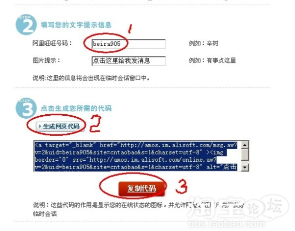 然后看到填写旺旺,把你自己的旺旺写进去,点击 "生成代码" ,然后下面的框里出现的代码,点击"复制"