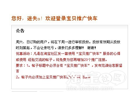 社区为什么会有那么多提到【宝贝推广快车】这个软件的帖子,是因为加入过这个软件的人,要是发了他们软件的帖子就能增加20个推广链接,一打开软件就可以看到这个软件写的公告,下面是截图,大家可以看