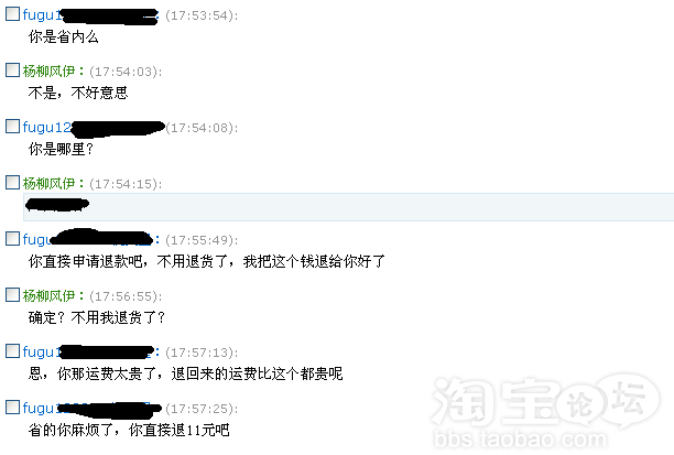 再次华丽丽的晕倒,居然想让我这边先付款,本来快递来到我这边,用了四五天,等我把东西退回去,到时候淘宝都自动确认收货了,我能怎么办,申诉退款么?卖家可以拒绝的啊。虽然是可以申诉,但谁都知道淘宝要申诉是一个很麻烦的过程,谁愿意为了那十几块钱纠缠那么久?卖家客服定想到这些,不过我也清楚这些流程,所以我坚决不同意,大家可以看看以下的对话,看是我怎么样让卖家自动给我退款的。