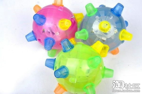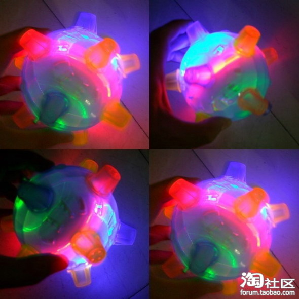 把玩具装上电池后,按下开关(在球的腰部有个金属按钮),球就会发出好听的音乐和绚烂的灯光(大白天也一样绚烂哦),并且不停的跳舞。球上有颜色缤纷的触角(橡胶材质),所以跳动的时候非常有弹性,忽左忽右、忽前忽后,宝宝们一定会被这么多的功能所吸引,高兴的跟着小球一起跳舞的!!刚会走路的小宝宝看到这个球说不定还会情不自禁的追随着它连走带爬呢!这模样是不是很逗人呀?就算再小点的宝宝躺在妈妈的怀抱里,也会被绚烂的灯光和好听的音乐以及弹跳的小球所吸引的!