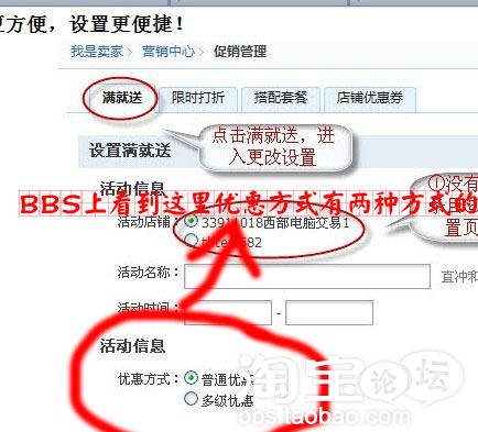 次次次日,我在淘宝上看到其他卖家可以设置≥2种的“满就送”形式,于是乎,我便重新跑回“我的淘宝”里面,在“更改设置”里面,我左找又找就是找不到可以设置多种的