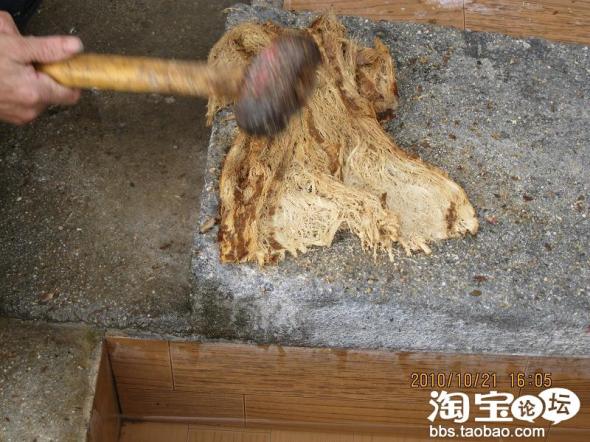 葛根粉制作一部曲:将葛根均匀的敲打粉碎!