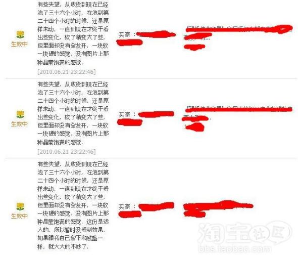 不过也有例外,0点的时候一个客户上线问我燕窝的一些问题,问我为什么泡了30多个小时之后,看燕窝跟粉条一样。我一听吓了一跳,白燕最多只需要泡5-6个小时。我马上就知道了客户的操作有问题。然后我就赶紧在线上跟客户沟通,跟她讲了一下泡发燕窝的操作过程,但客户坚持认为她的做法没有问题,一定是我们的燕窝不好。我极力的向客户解释为什么会出现她那种情况,她没有回答我。我以为客户已经默认同意了我的解释,过了一会三个评价,我也跟往常一样直接批量回评,可是回评后的评价管理看到的三个差评。