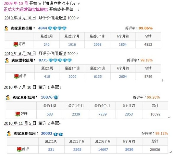 2009年10月开始在上海设立物流中心,正式大力运营宠友网淘宝旗舰店epetsky,经过5个月的摸索期后,2010年3月份开始显著成长。2010年4月10日,月评价信用超过1000。2010年6月26日,月评价信用超2000。2010年7月10日荣升1皇冠。2010年11月5日荣升双皇冠!
