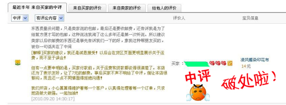 第四月,一个辽宁的客户,没经过沟通,就给了个中评。原因是包邮和不包邮的问题,其实在买货发货之前已经做了很明白的沟通解释!但中评后还一直拒绝进行协商和解释。开始还是很郁闷,甚至气得想发火,投诉也没用,最后还得来一句:“再联系我,我就给你差评”的恐吓语
